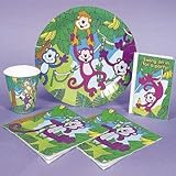 Neon Monkey Tableware. Includes 16 luncheon napkins and 8 of each: invitations, 9" plates and 9-oz. cups. (40 pcs./set)