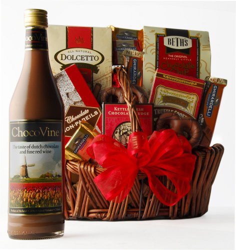 Chocovine Say it With, Chocolate lovers rejoice! This basket pairs a selection of chocolate squares, bars, cookies, pretzels and more with ChocoVine chocolate dessert wine. ChocoVine is a fine French Cabernet subtly combined with a rich dark chocolate from Holland, blended to create a decadent, silky smooth drink. Wine Gift Basket Includes: ChocoVine Chocolate Dessert Wine: ChocoVine is a fine French Cabernet subtly combined with a rich dark chocolate from Holland, paired together to create a decadent, silky smooth drink. It can be served on the rocks or as the main ingredient to an array of sinful cocktails. Two Chocolated Covered Pretzels from Rocky Mountain Chocolate Factory Two Ghirardelli Dark Chocolate Squares .375 oz Two Ghirardelli Milk Chocolate Caramel Filled Squares .375 oz Beth's Chocolate Chip Cookies 2 oz Dolcetto Wafer Rolls 4.4 oz Kettle Fresh Chocolate Fudge 1.4 oz Non Pareils 5 oz Truffle Cookies 1.8 oz 2 Ghirardelli Caramel Filled Bars 1.15 oz Please note that due to the popularity of this product, we reserve the right to substitute like wines and vintages of equal or greater value.