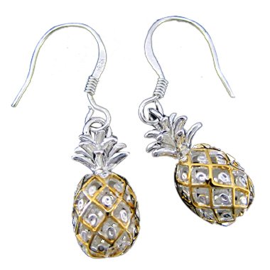 925 Silver Pineapple, 3-D pineapple dangle Earrings. French hook. Accented with yellow gold.Please note the picture shown is not a true depiction of how large/small the items is. Please look at the measurements for accurate size. Mahalo!